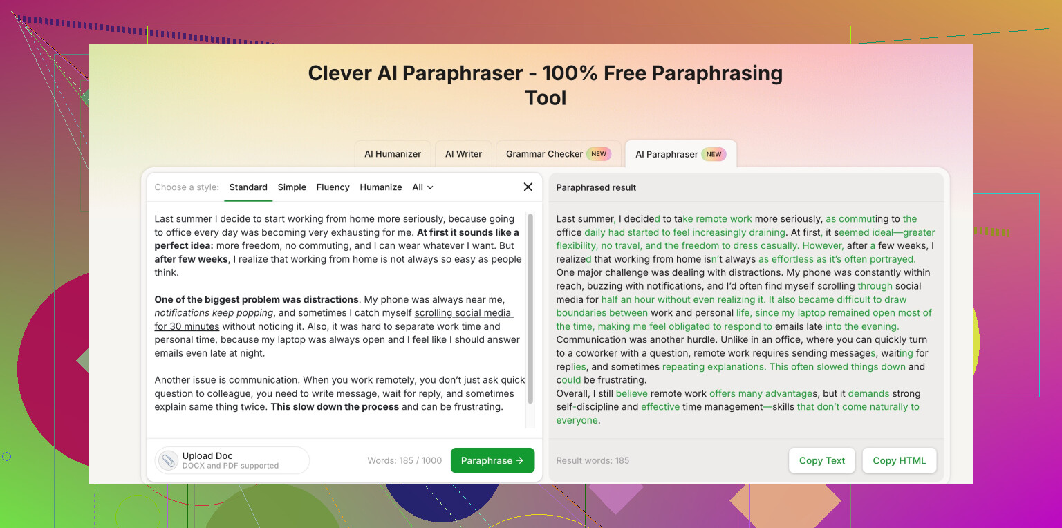 Their advanced free AI paraphrasing tool for clear, human-sounding text works nicely on longer paragraphs without turning them into nonsense. You still need to read and tweak, but it saves a lot of time compared to manual-only. -