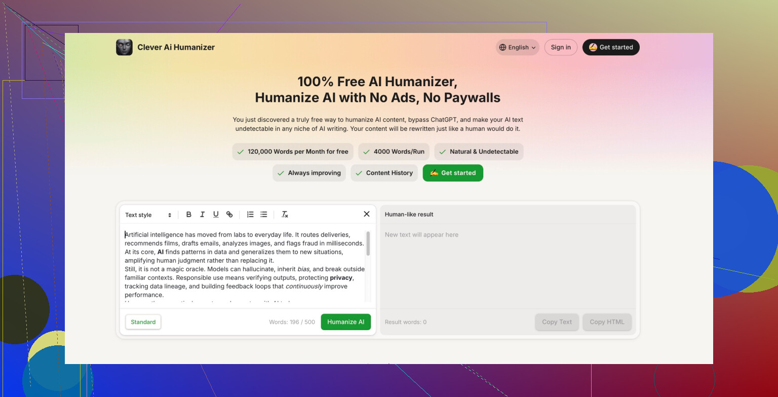 Honestly, everyone’s hyping Clever Ai Humanizer (I see you @mikeappsreviewer and @voyageurdubois!), and yeah, it does the trick for most quick jobs. But let’s not kid ourselves—no AI humanizer is gonna magic wand your stiff copy into the next Hemingway. Clever Ai Humanizer is decent, works for free, and it’s not buried under ads or popups every five seconds, which puts it ahead of a lot of the free pack. But for every good pass, sometimes I get a weird turn of phrase that just screams “generated by robot” with sprinkles.