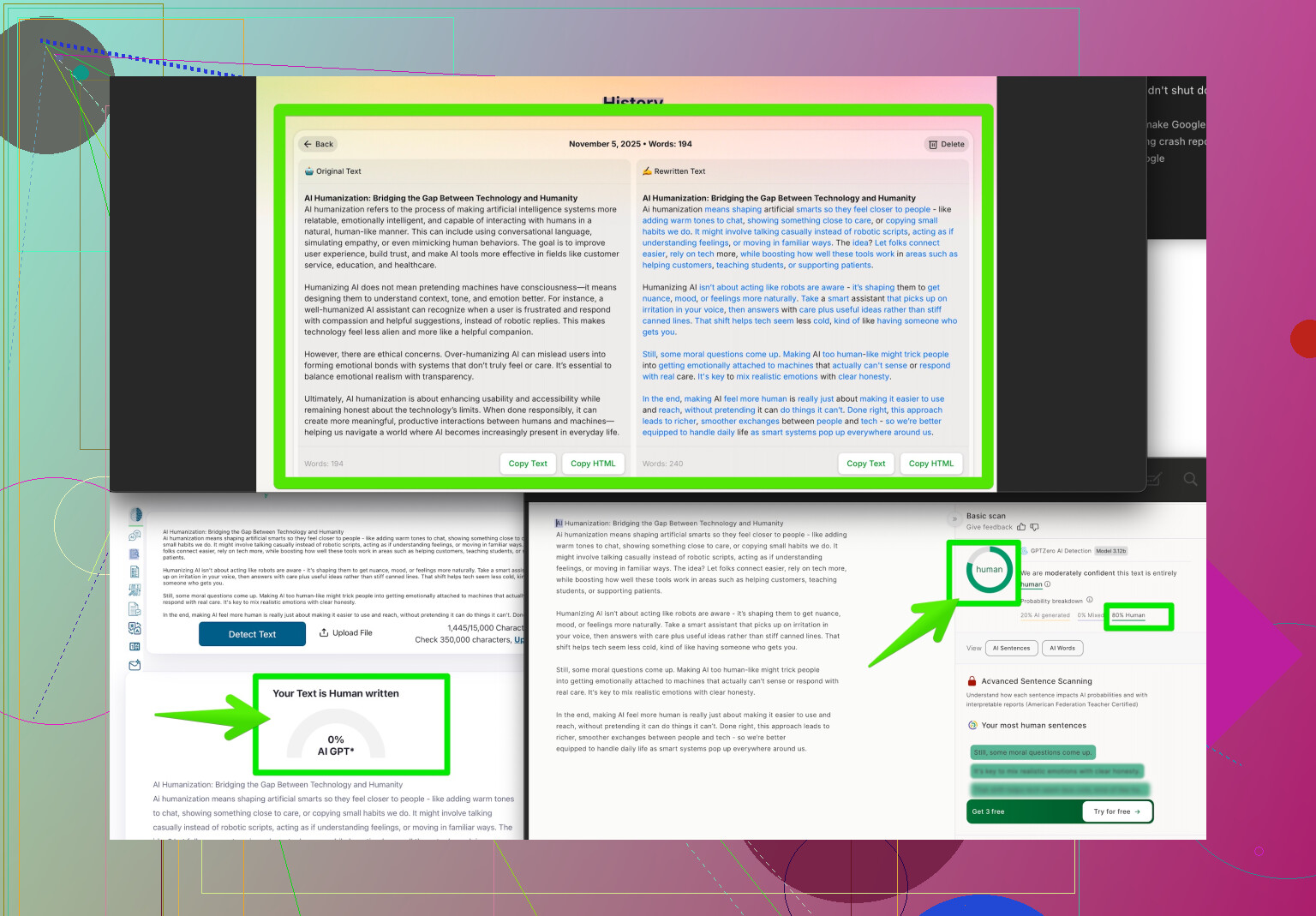 - Pros: Actually makes the text sound less robotic, evades basic detectors surprisingly well, and is pretty easy to use. Good for last-minute “make it pass” situations.