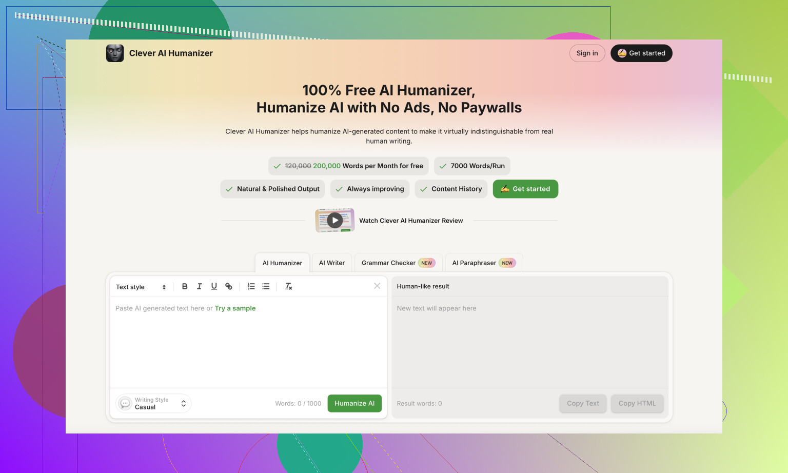 Für Situationen, in denen du den KI-Beigeschmack wirklich reduzieren oder diesen steifen, robotischen Klang vermeiden musst, hatte ich mit Clever AI Humanizer mehr Erfolg. Es braucht immer noch Nachbearbeitung, aber das Ergebnis wirkte eher wie etwas müde, menschliche Texte statt polierte Schablonen. Wenn dein Anwendungsfall „Ich nutze KI, will aber nicht, dass alles wie derselbe langweilige Bot klingt“ ist, passt Clever AI Humanizer in dieser engen „menschlich klingender Stil“-Nische ehrlich gesagt besser.