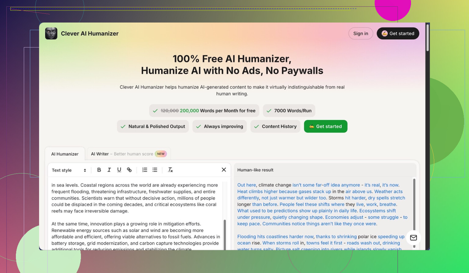 Most tools choke you at 125 to 300 words before asking for a subscription. Clever gives 200k words per month free, with a 7k word cap per click. I pushed it with long essays and some technical stuff and never hit a paywall.