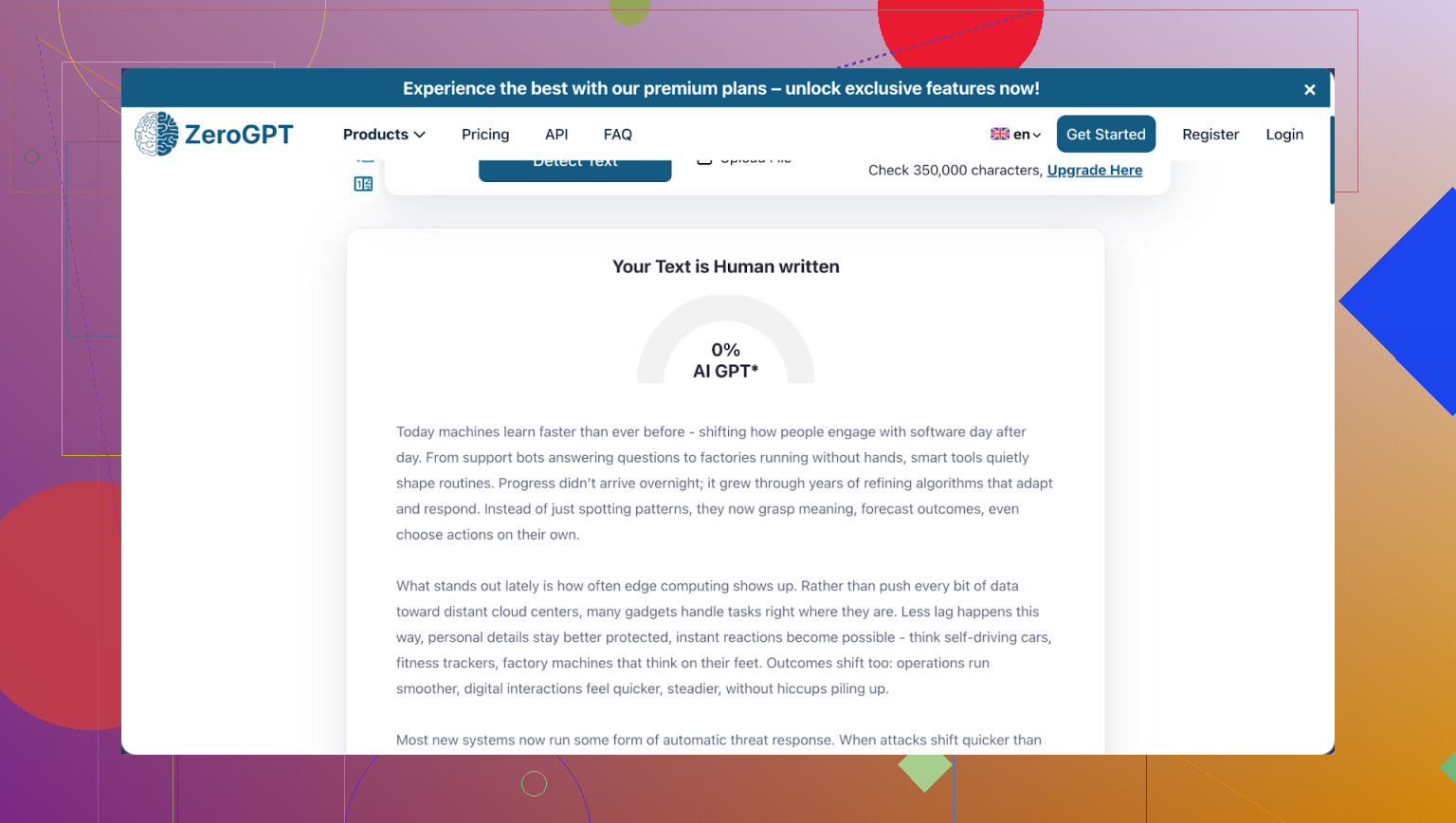- GPTZero showing mixed or low likelihood, not necessarily “100 percent human.”