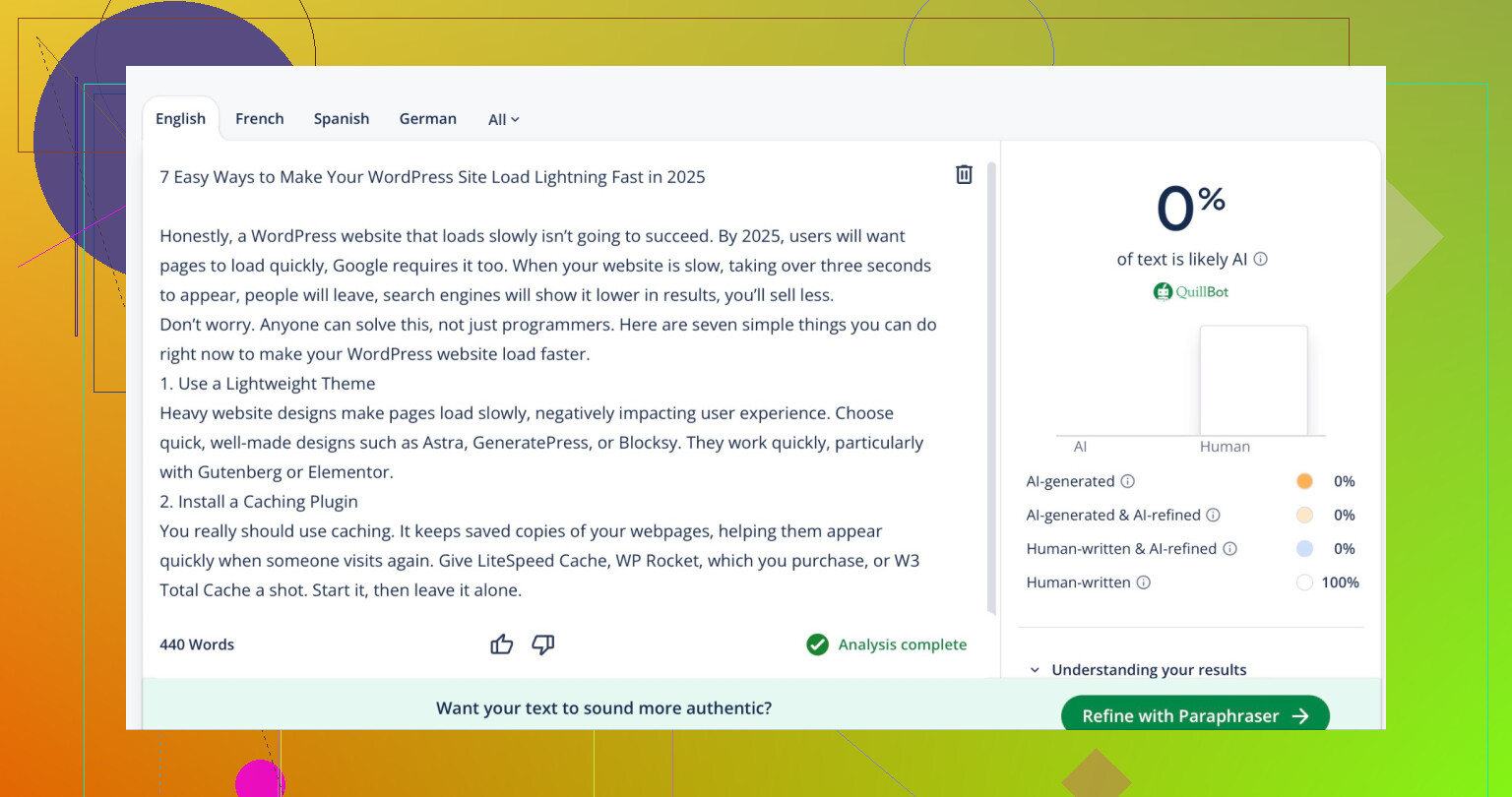 If you like seeing AI detectors get bamboozled, ZeroGPT is a riot. Write like you’re chatting at a barbeque, and this checker eats it up—“Yep, totally a human at the keyboard.” Out of all the tools, ZeroGPT is probably the most fun to throw curveballs at. Just don’t go too formal, or it sniffs something out.