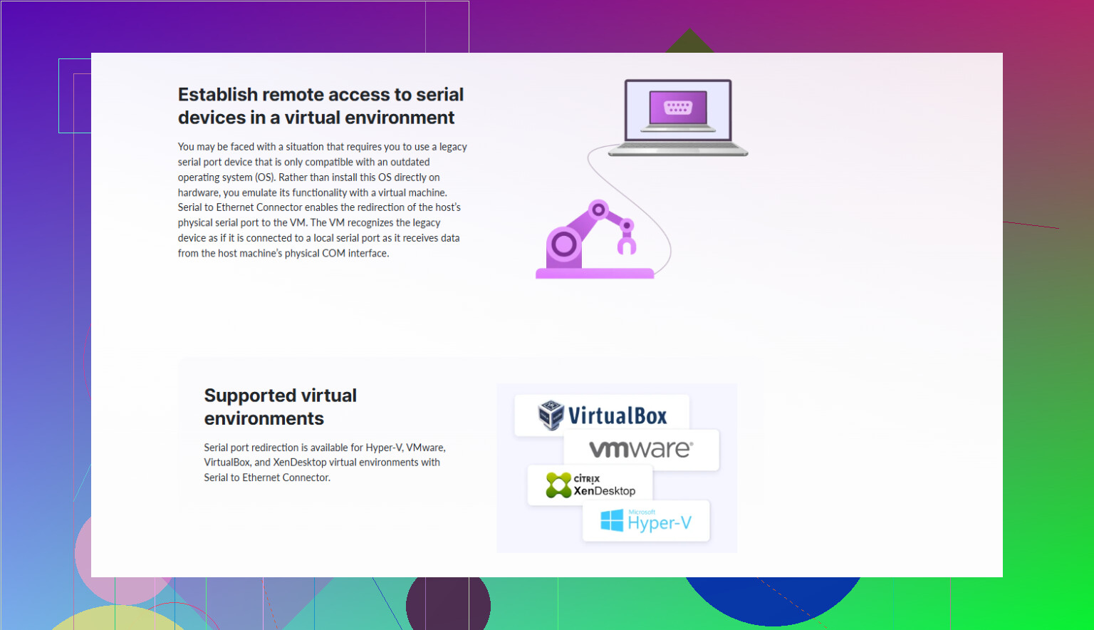 - Virtual COM mapping lets legacy tools work as if the serial port is local.